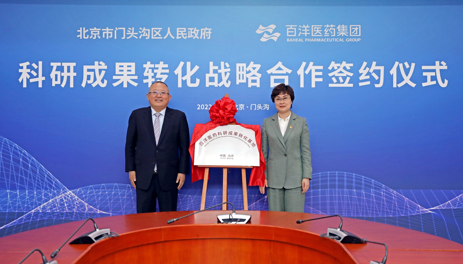 金暉、付鋼共同為“百洋醫(yī)藥科研成果轉(zhuǎn)化基地”揭牌。