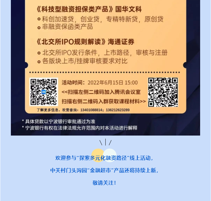 為創(chuàng)新銀政企對接平臺,引導(dǎo)金融機(jī)構(gòu)和有融資需求的企業(yè)“面對面、零距離”對接,精準(zhǔn)破解中小微企業(yè)融資難、融資貴、融資慢的問題,讓更多金融“活水”高效快捷注入到實(shí)體經(jīng)濟(jì)中,6月15日下午3點(diǎn),中關(guān)村門頭溝園金融超市將推出最新一期“政策解讀+創(chuàng)新產(chǎn)品推介”的線上活動——探索多元化融資路徑。